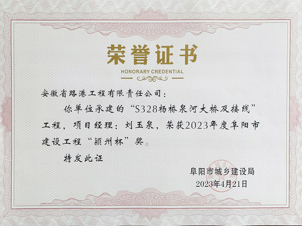 4月21日,安徽路港承建的S328杨桥泉河大桥及接线工程、阜阳港临泉港区综合码头,荣获阜阳市城乡建设局颁发的2023年度阜阳市建设工程“颍州杯”奖。